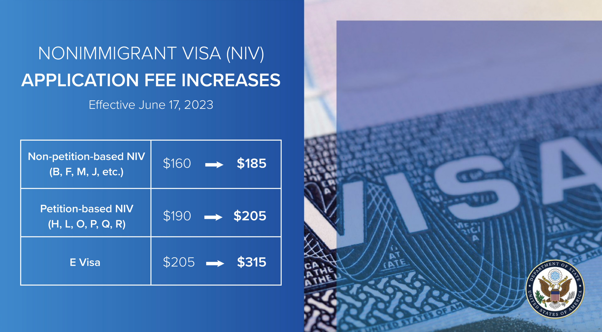 On June 17, 2023, the nonimmigrant visa (NIV) application processing fee for a treaty trader, treaty investor, and treaty applicants in a specialty occupation (nonimmigrant E category) visa will increase from $205 to $315. NIV fees paid prior to June 17, 2023, will remain valid through the expiration date of the fee receipt.